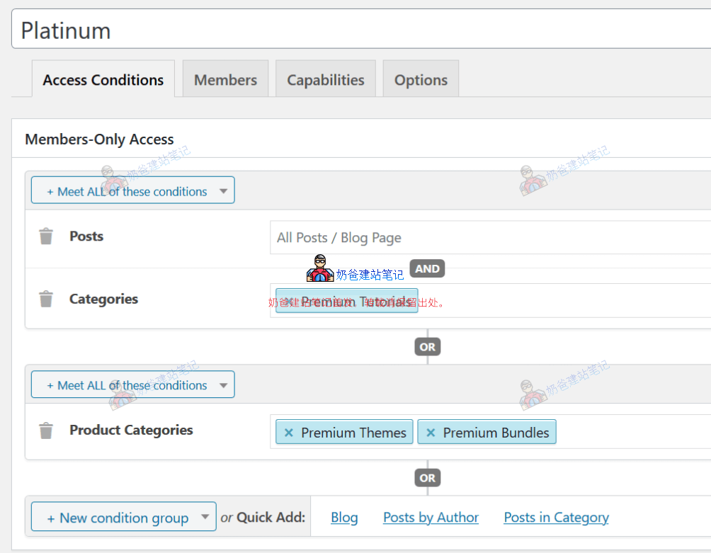 可以添加多个判断条件,然后在Members设置用户组,Capabilities里面设置权限,然后保存即可生效。