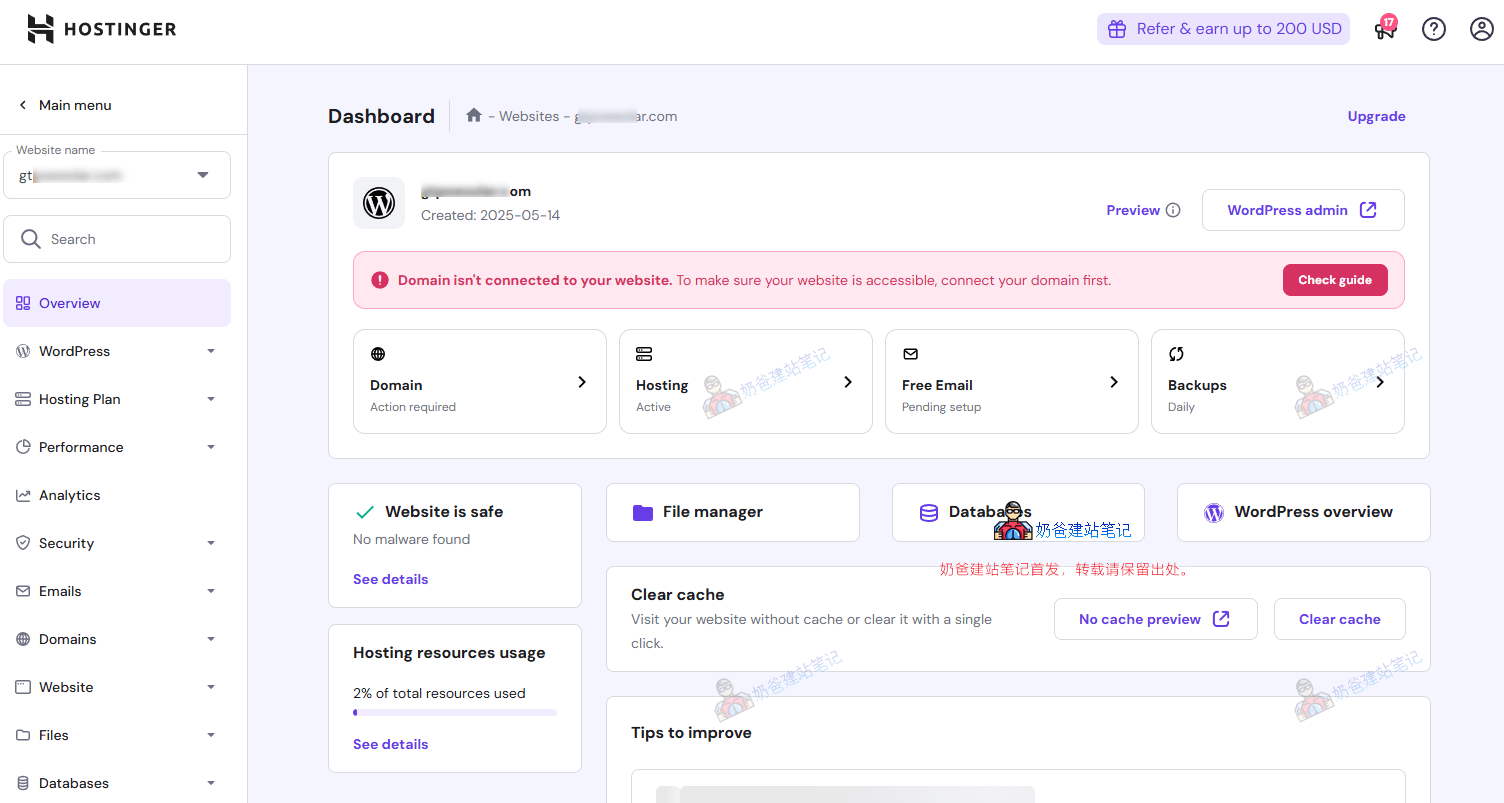 当你付款成功后,系统就会开通你的服务,登录到Hostinger后台,可以看到下面这样的界面(因为Hostinger会不定期对网站界面改版,可能你看到的界面和本教程有所出入,请随机应变。)