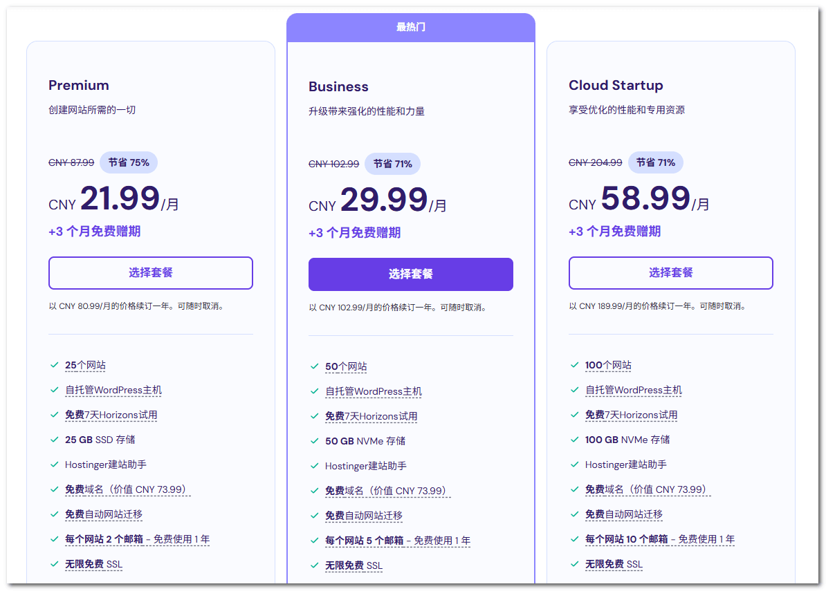 是不是觉得Hostinger的价格要有诱惑力的多?关键是Hostinger的Premium套餐你也可以搭建多个网站(限制25个),是不是感觉性价比更高了?