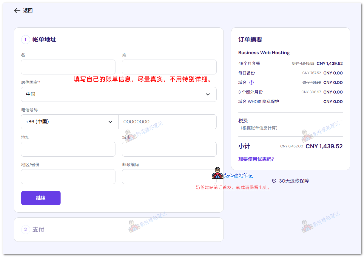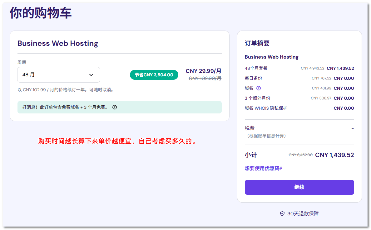 添加到购物车后,选择购买年限,不得不说Hostinger的定价很鸡贼,买4年算下来价格最便宜,但是一下给又有点多,所以购买1年、2年,还是4年,自己考虑一下,服务商跑路的可能性还是比较小的,你唯一需要担心的是你网站能不能坚持4年。
