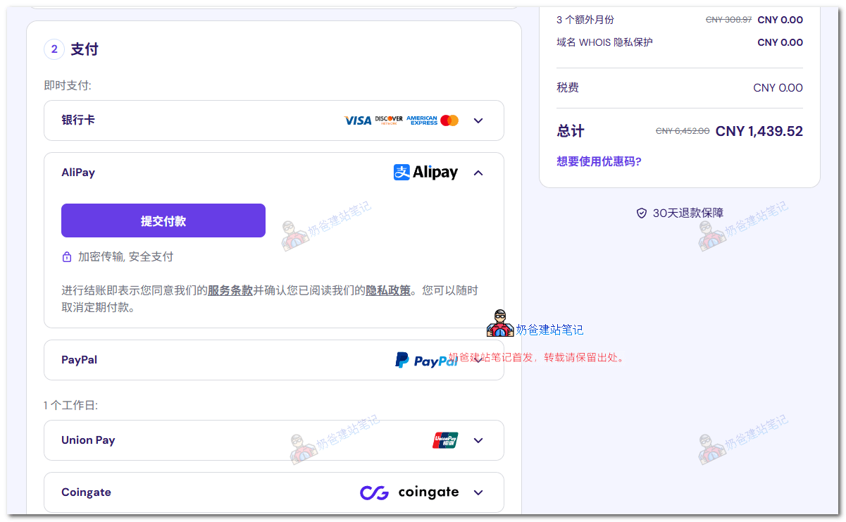 Hostinger支持支付宝付款,所以国内用户购买起来非常方便。提醒的是,付款后需要等待网页自动跳转,网速慢的话就多等一下。