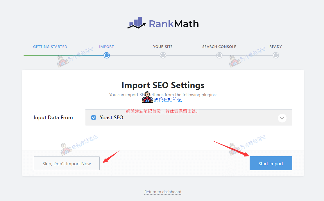 你如果安装过其他SEO插件的,例如Yoast SEO,那么可以选择导入(Start Import)或者跳过导入(Skip)。