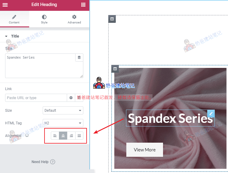 点击你需要修改的文字,或者按钮,然后左边会出现一个Alignment的选项,就是控制显示居中或者靠左的。 都修改完毕后更新页面就可以了。 最后,使用elementor的过程中你会发现有些功能是pro才能用的,你可以点击这里去官网购买一个。 查看更详细的elementor 教程