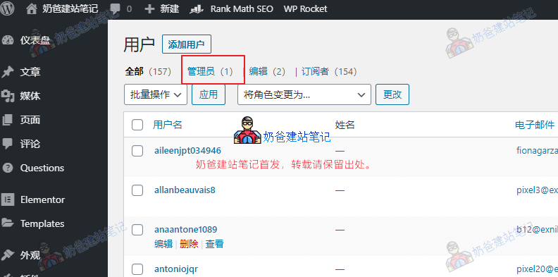 在WordPress仪表盘后台的用户里面,可以看到你网站上的用户列表,通常主要关心管理员账号就可以了。 正常的网站如果你没有手动添加,那么就只有一个管理员账号。当你发现有不认识的管理员账号,那么就要小心了。 而如果你网站上使用了WooCommerce搭建在线商店,那么肯定会有很多注册账号。只有编辑或者作者这样的账号才可以在你网站上发文章,所以也需要关注一下。