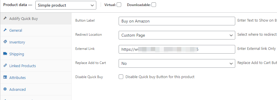 自己填写上buy on amazon,然后跳转选择自定义页面,下面输入网址,发布产品后就会出现一个跳转到亚马逊的按钮。没有自己改链接则就是加了一个快速购买的按钮。 [/vk-content]